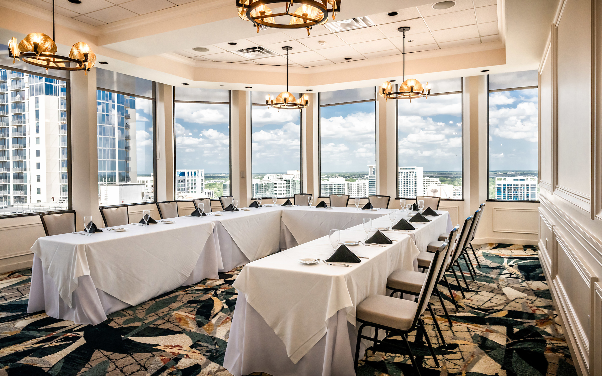 Our versatile and configurable ballroom offers amazing views of Orlando and configurable space for an event of up to 250 guests for a seated dinner or a reception for 450. The ballroom can also be configured to host smaller events.